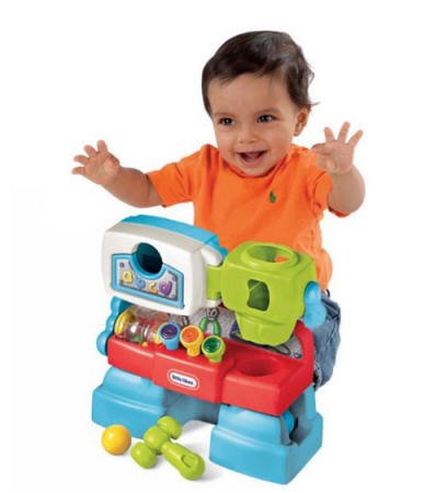 Este pequeño banco de trabajo dispone de luces, sonidos y actividades motrices para la diversión de los más pequeños. Golpeándolas con el martillo las 3 pestañas de colores se iluminan y ofrecen distintos sonidos. La puerta de la caja de herramientas se abre para poder recoger las herramientas cuando no se esté trabajando.