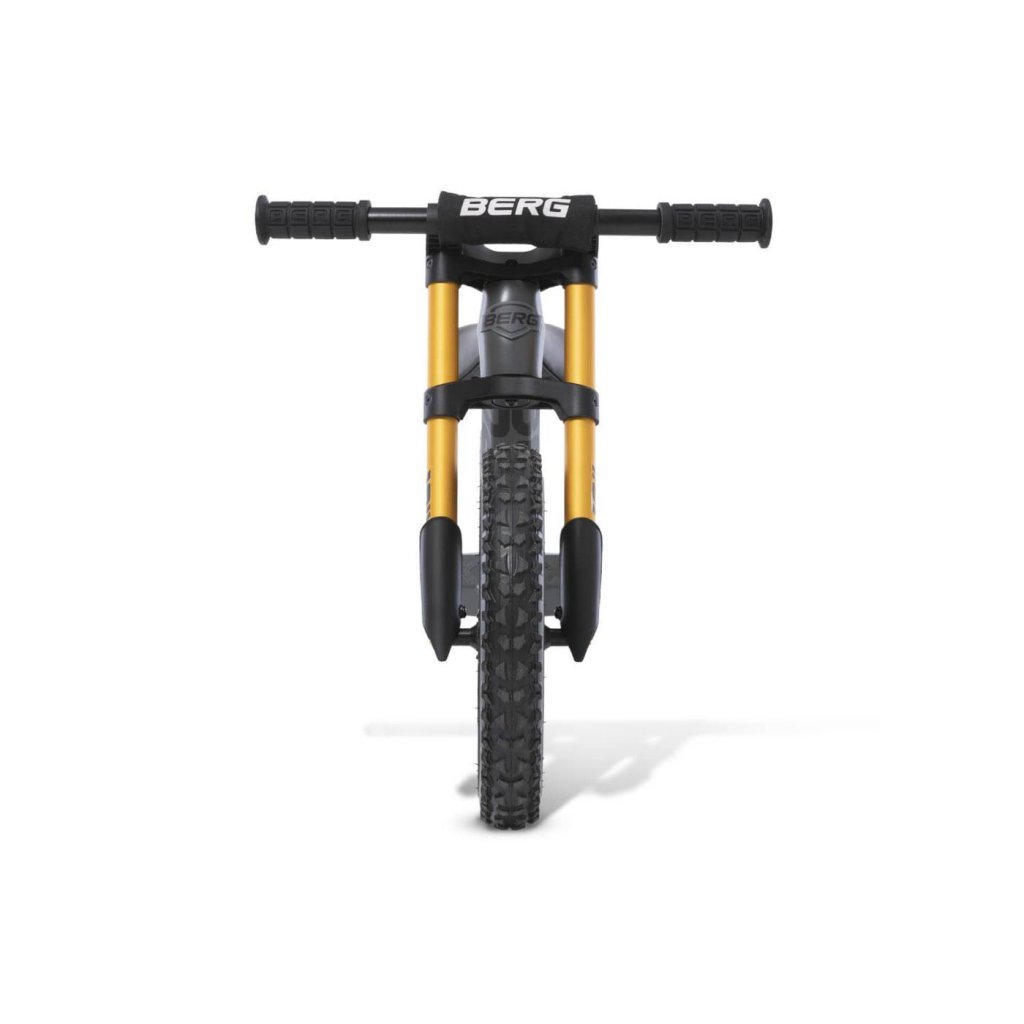 El correpasillos BERG BIKY Cross Grey cuenta con dos ruedas de neumático de 30 cm de diámetro con llantas de aluminio, con más taco y más agarre, y la horquilla de la rueda frontal de color dorado. Todos estos detalles le dan una imagen off-road más aventurera. Además, como todos los modelos BIKY, tiene un regulador de ángulo de giro. Este regulador permite que el manillar tenga más o menos capacidad de giro en función de la habilidad de su conductor. Se recomienda que empiece a correr con el ángulo de giro limitado y, cuando tenga práctica, liberarlo.