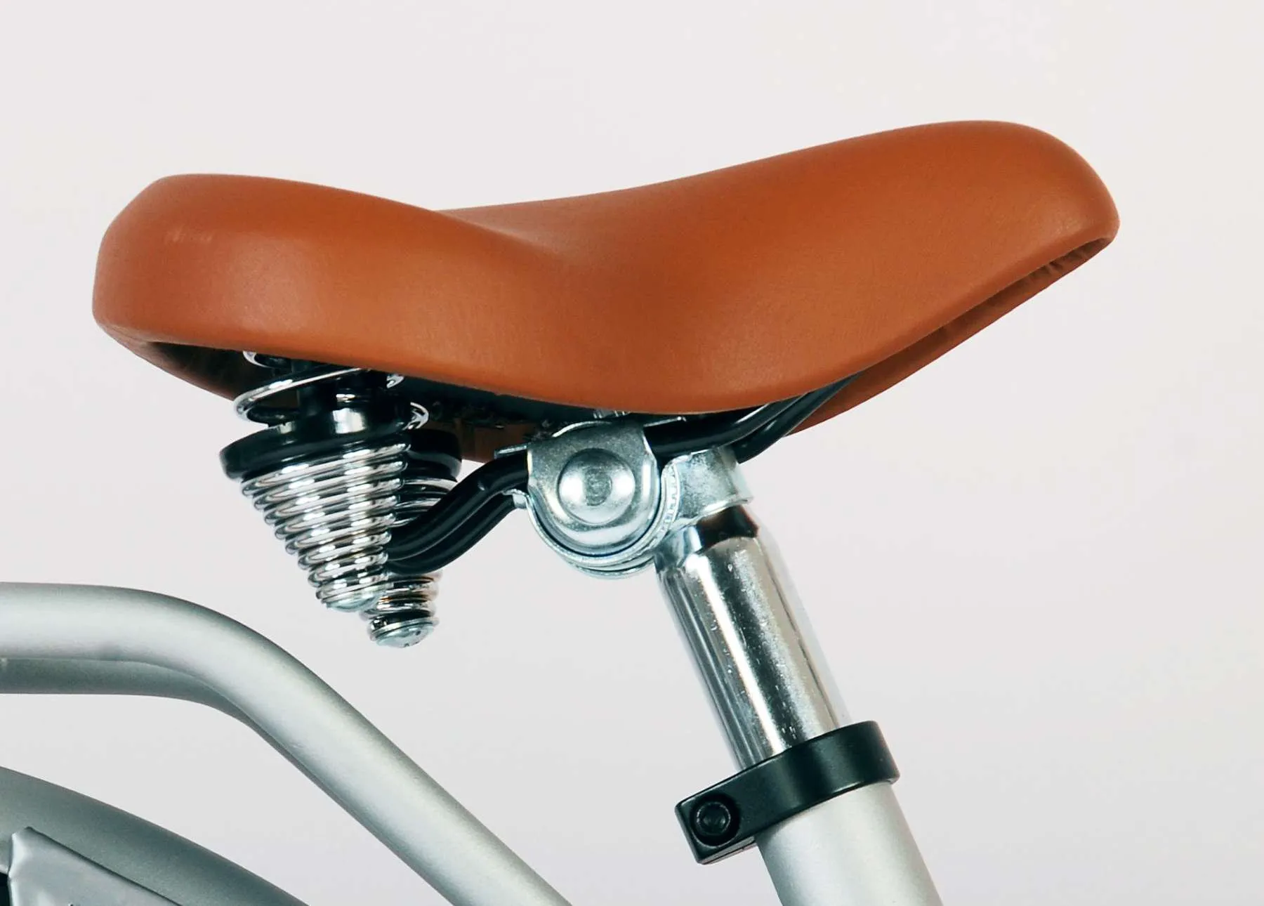 Es por eso que esta genial bicicleta tiene un freno de mano y un freno de contrapedal. También tiene iluminación delantera y trasera a pilas y un bonito timbre. También hemos pensado en la comodidad. La hermosa bicicleta plateada mate Oma Classic tiene un candado resistente, un práctico portabultos delantero y trasero con correas de liberación rápida y un soporte para que tu bicicleta se mantenga limpia y ordenada.