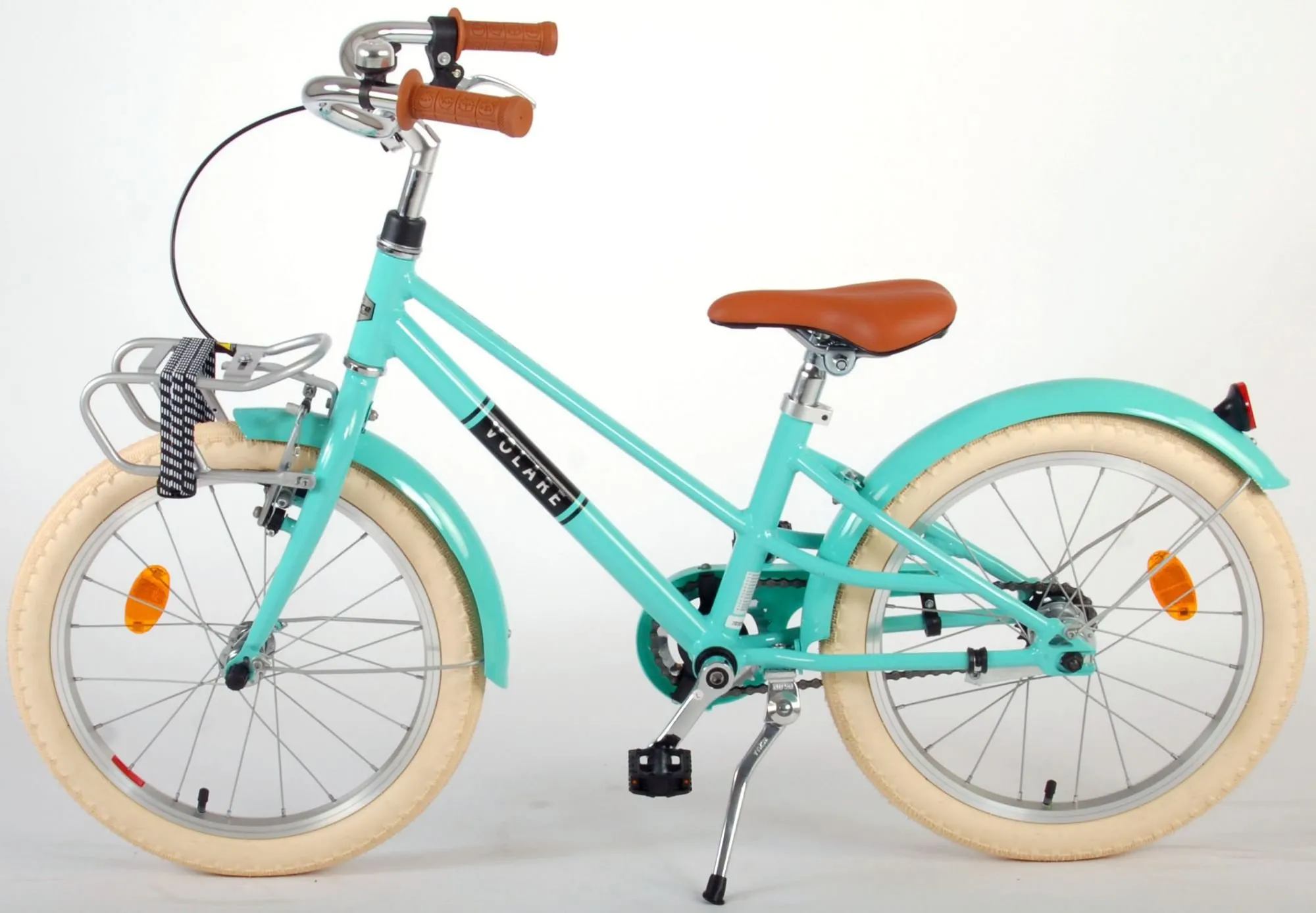 Por lo tanto, esta genial bicicleta tiene freno de mano y freno de contrapedal. Además, la bicicleta tiene reflectores en las ruedas y en la parte delantera y trasera de la bicicleta y un bonito timbre. También hemos pensado en la comodidad. La hermosa bicicleta turquesa Melody tiene un cuadro de aluminio extra liviano, un práctico portaequipajes delantero con correas de liberación rápida y un soporte para que su bicicleta permanezca limpia y ordenada.