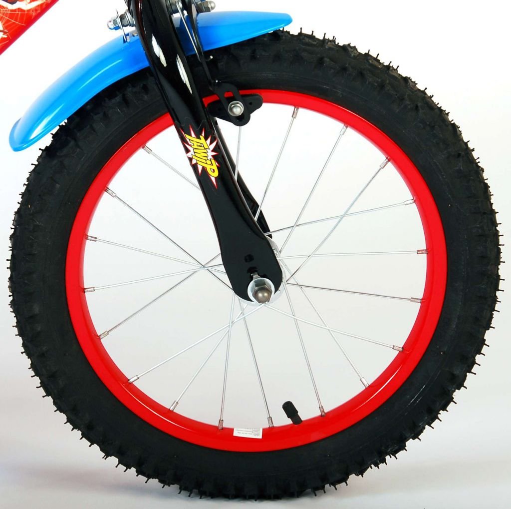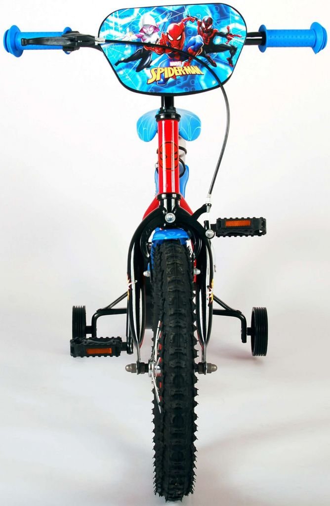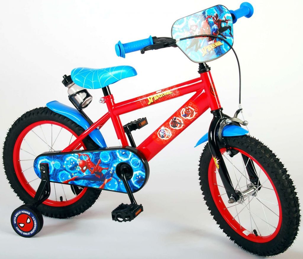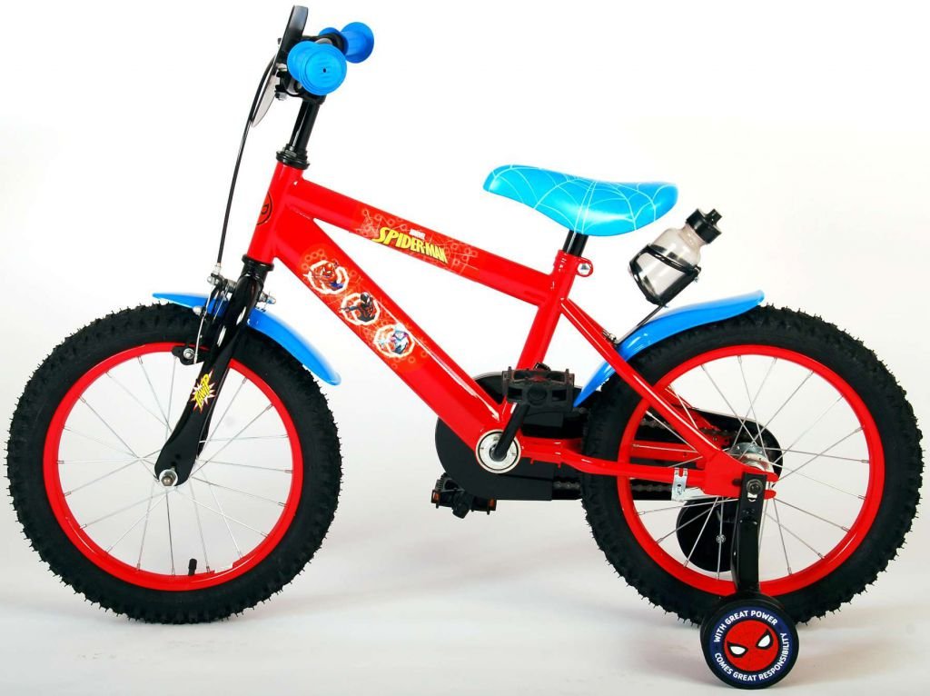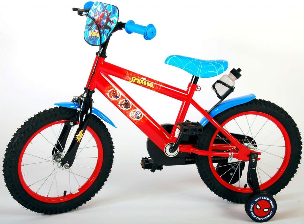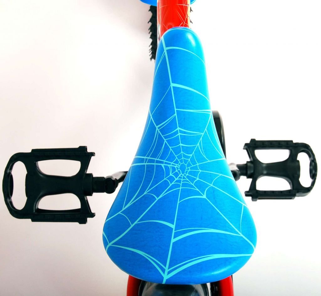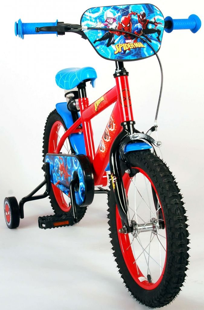 Es por eso que esta genial bicicleta tiene un freno de mano y un freno de contrapedal y una caja de cadena cerrada. Además, la bicicleta cuenta con ruedas laterales desmontables para un rápido aprendizaje sobre la bicicleta y reflectores en los pedales. También se ha pensado en la comodidad. La hermosa bicicleta roja de Spiderman con detalles en azul tiene un portabotellas debajo del sillín, un sillín agradablemente suave y un marco extra resistente que puede soportar golpes.