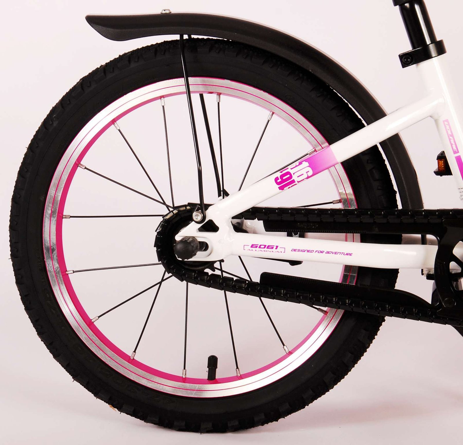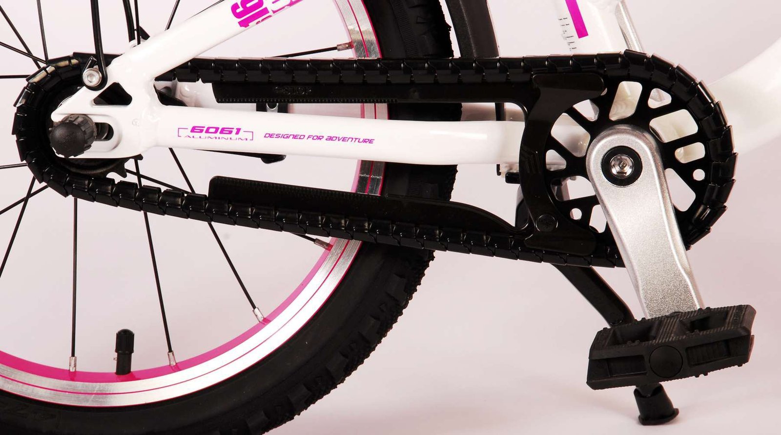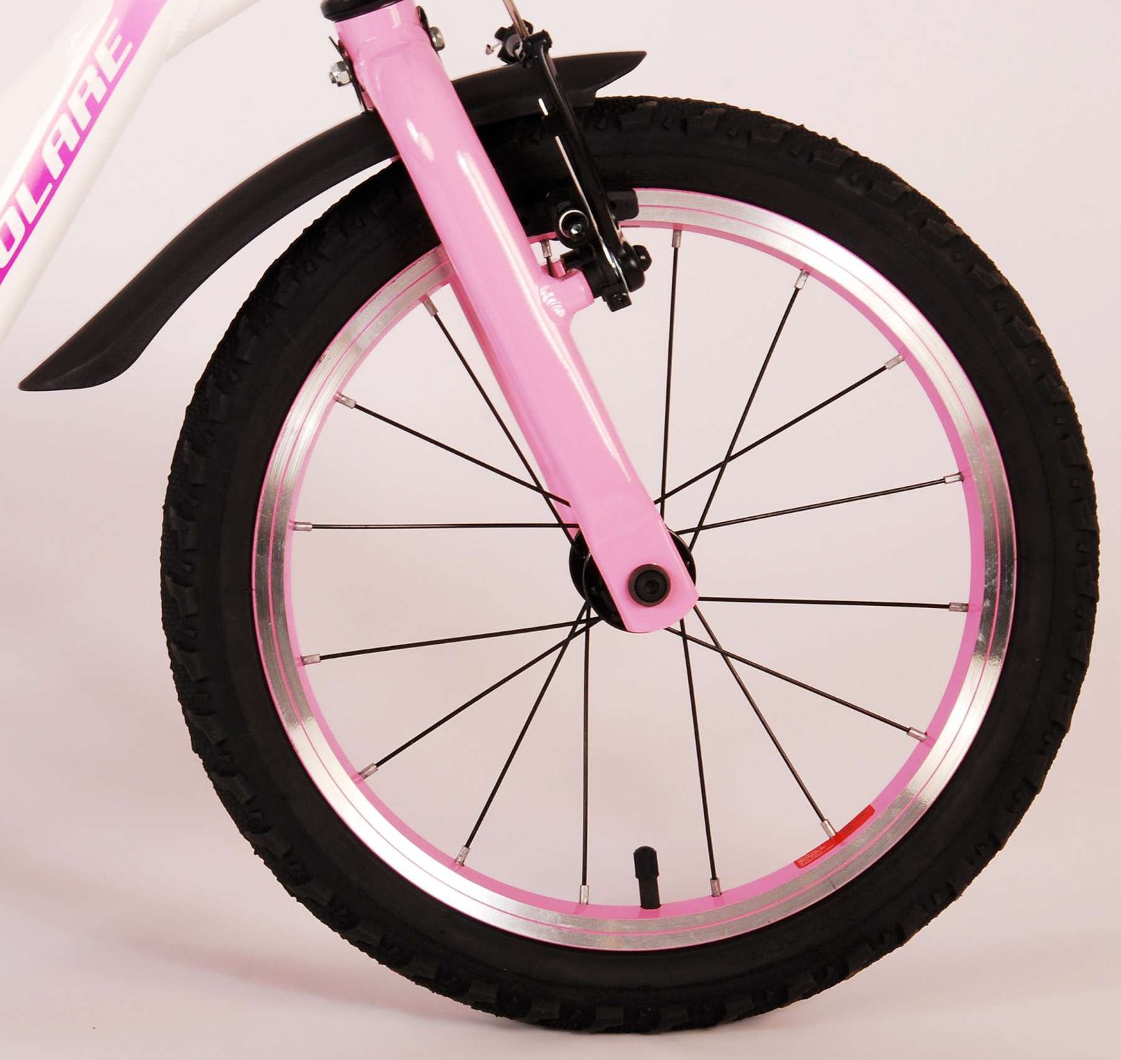 ¡La seguridad es lo primero! Es por eso que esta genial bicicleta tiene un freno de mano, un freno de contrapedal y un chainlooper. Además, la bicicleta tiene reflectores en los pedales y un lindo timbre. También se ha pensado en la comodidad. La hermosa bicicleta Volare blanca con detalles en rosa perla tiene un cuadro de aluminio extraligero (¡solo pesa 5,9 kilos!), un sillín suave y cómodo, puños de cratón y un soporte resistente para que tu bicicleta siempre se mantenga ordenada. Para disfrutar de la bicicleta el mayor tiempo posible, cuenta con una tija de sillín extralarga para que la bicicleta crezca con el niño aún más larga (el manillar no es regulable en altura).