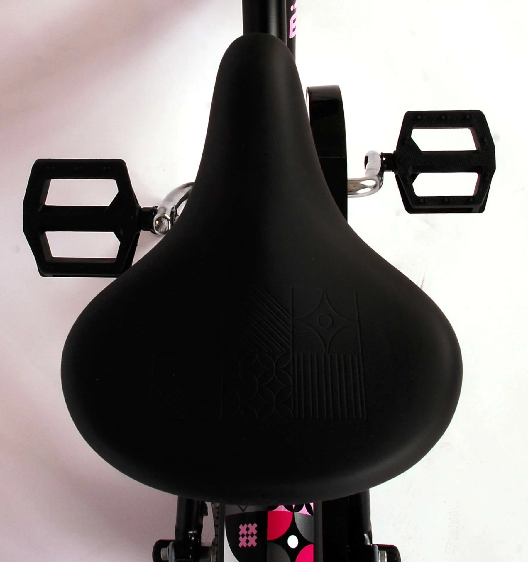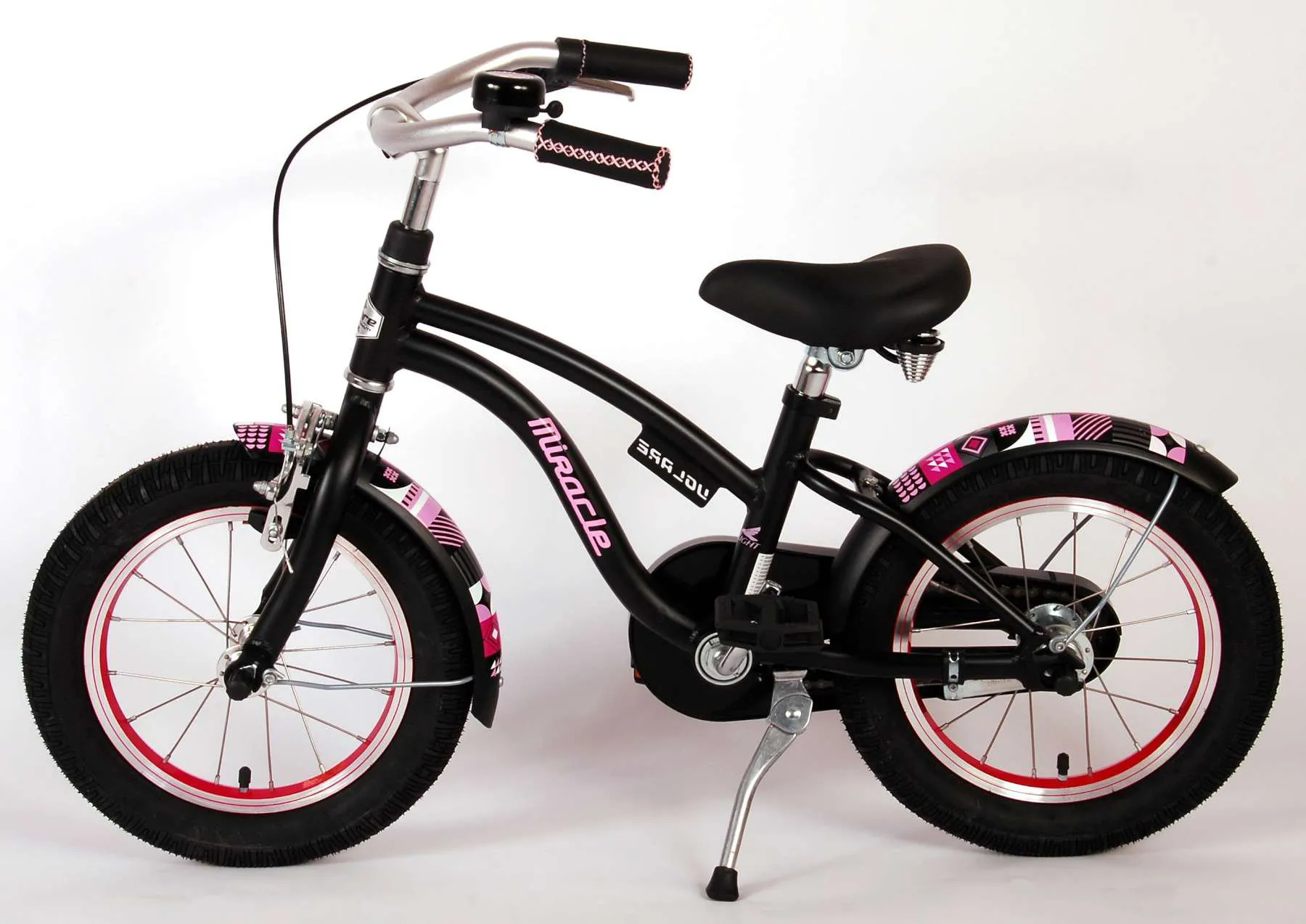 Es por eso que esta genial bicicleta tiene un protector de cadena cerrado para proteger los dedos. La bicicleta también tiene reflectores en los pedales. Esta bicicleta tiene un freno de contrapedal y un freno de mano. Esta hermosa Miracle negra mate y rosa tiene un marco de aluminio extra liviano, un soporte para mantener la bicicleta en su lugar y un sillín cómodo y suave. Para disfrutar de la bicicleta el mayor tiempo posible, el sillín y el manillar son regulables en altura.
