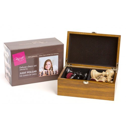 Las piezas se presentan en una elegante y bella caja de madera de nogal, que está firmada por Judit Polgar.