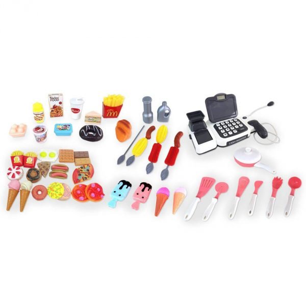 Mas de 20 accesorios incluidos: con bandeja para preparar y servir comida, caja registradora, horno con puerta, variedad de accesorios de comida incluyendo helados, hamburguesas, patatas… utensilios para cocinar y mucho más.