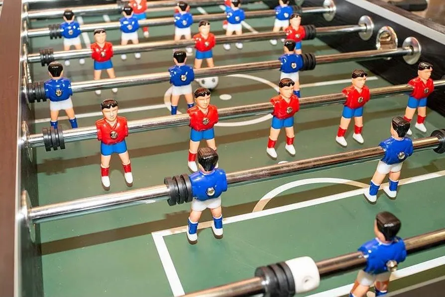 Futbolín de gran tamaño con un diseño moderno. Estructura de madera contrachapada con una alta resistencia a la deformación. Incluye patas metálicas independientes de gran robustez con niveladores individuales para evitar un posible desnivel en el suelo.