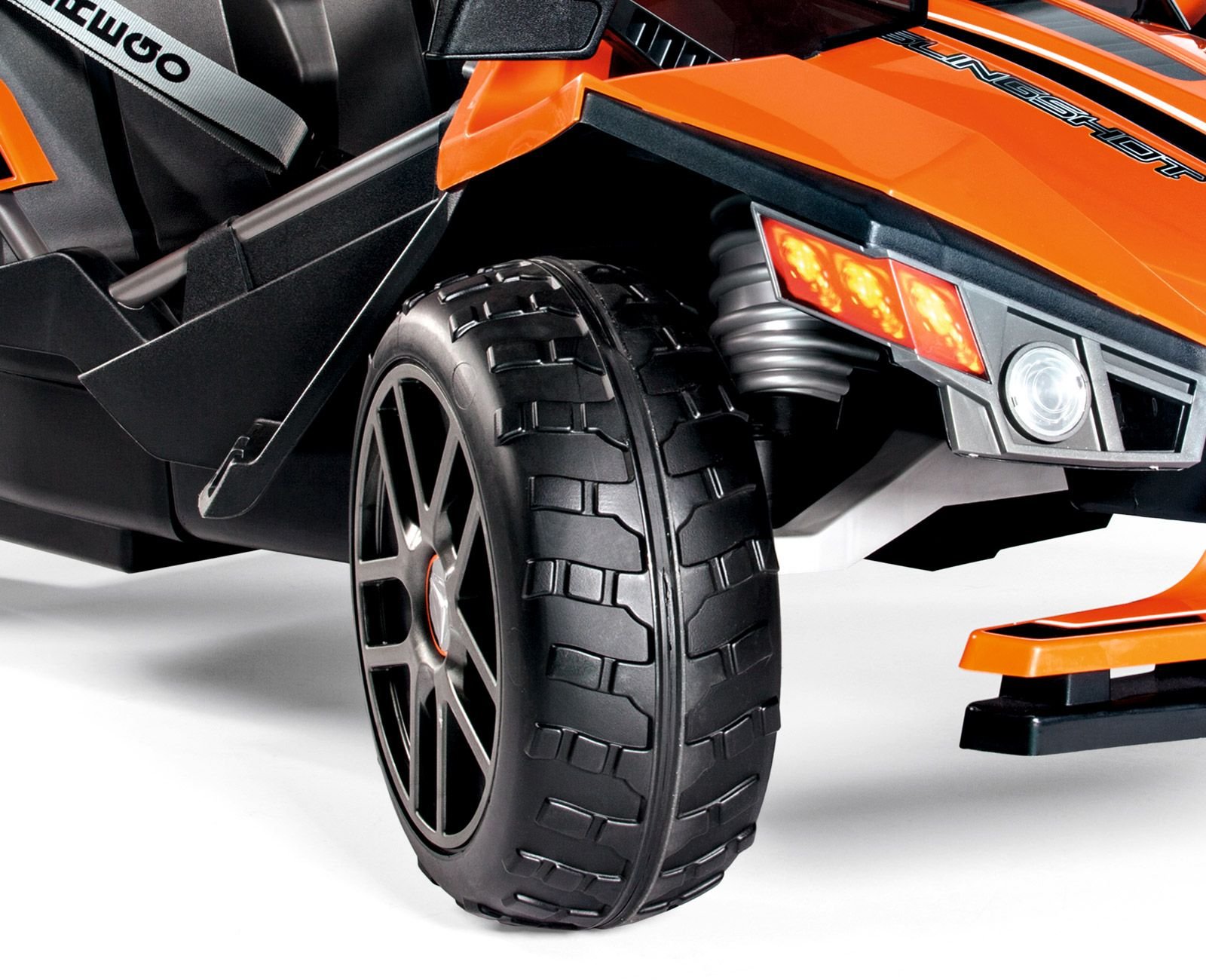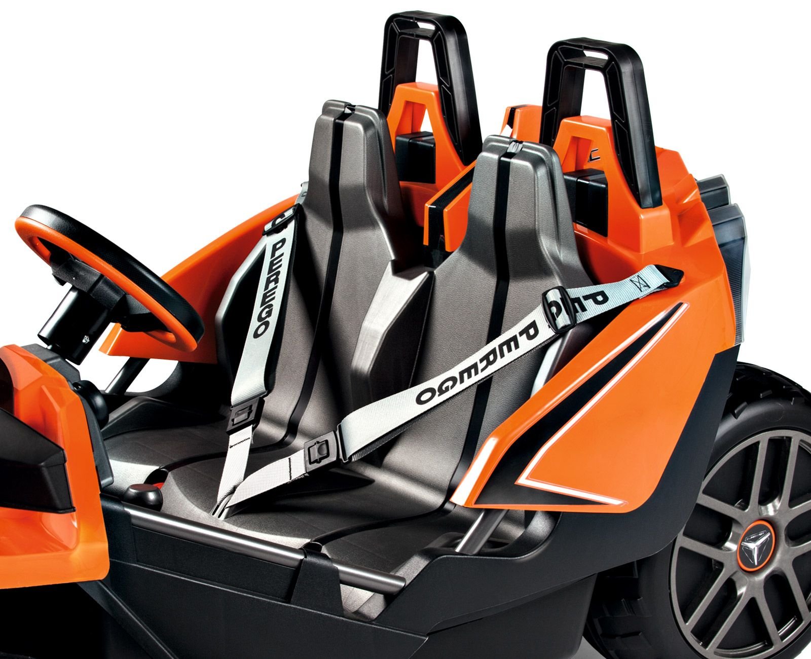 Este fabuloso diseño de dos plazas está inspirado en el modelo Slingshot de la reconocida empresa estadounidense Polaris. Ideal para niños a partir de 3 años Dispone de batería de 12V-12Ah y dos potentes motores de 230W, que permiten afrontar con facilidad los terrenos más accidentados y desniveles con una inclinación de hasta el 17%..La calidad de los productos Peg Perego se ve en los detalles que garantizan la seguridad. Este producto tiene la parte inferior cerrada para proteger al conductor de los hilos eléctricos y de la posibilidad de introducir las manos, así como para proteger el vehículo de agua, barro y arena. La batería está protegida por un cierre de seguridad a prueba de niños.