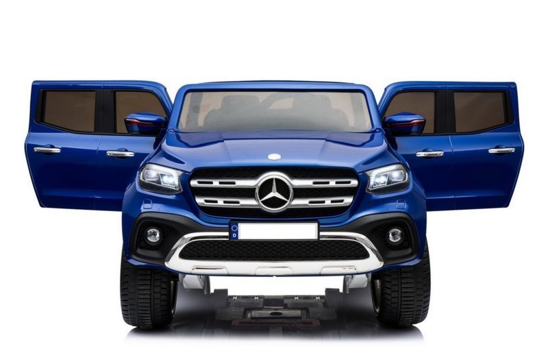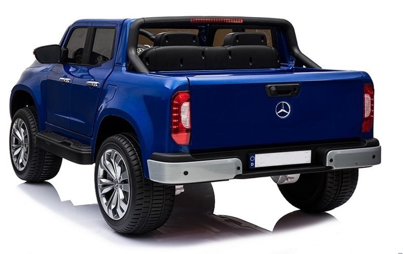 Fantastica furgoneta Mercedes Pickup X Class en color azul metalizado espaciosa y resistente. Ideal para dos niños en busca de aventuras gracias a las ruedas de caucho antipinchazos y a los 4 motores que le dan tracción a las 4 ruedas. Ahora con batería 12V/10Ah y gracias a su pantalla MP4 pueden disfrutar de sus dibujos favoritos en los descansos. Con un amplio maletero trasero ideal para guardar todos los juguetes.