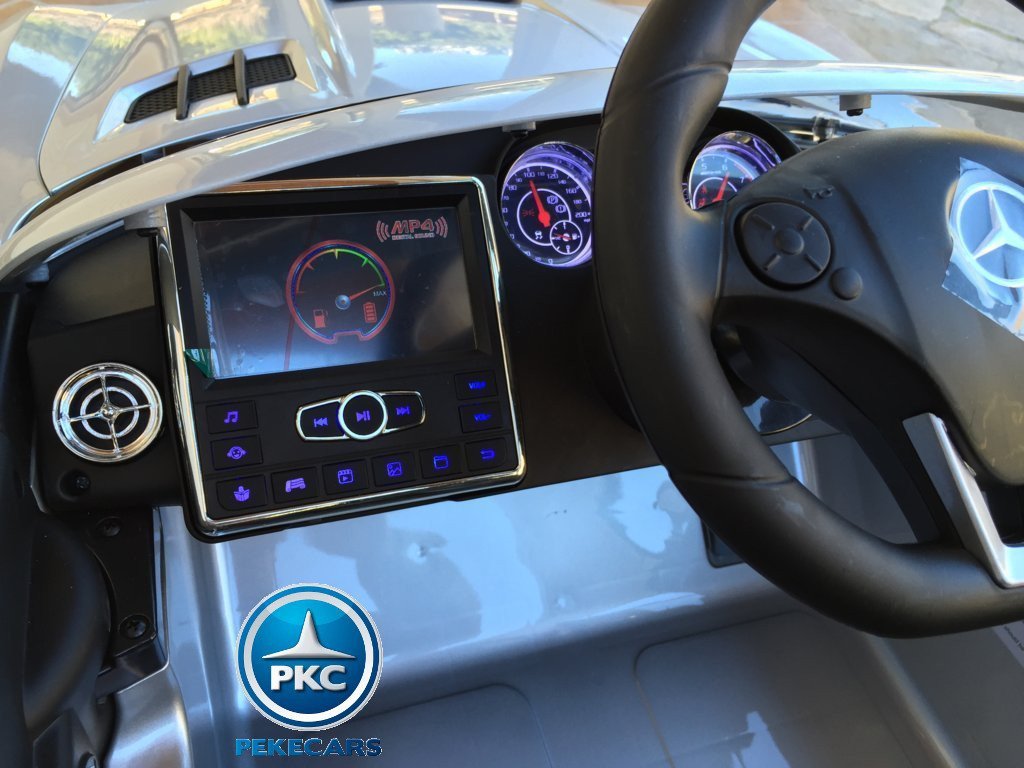 Nueva version del mercedes SLS de color plata metalizado, ahora incluye motivos de fibra de carbono en el capo. Tambien esta equipado con un volante electronico, que facilita la conduccion, ruedas de caucho antipinchazos con luces y una pantalla MP4 para reproducir musica y videos