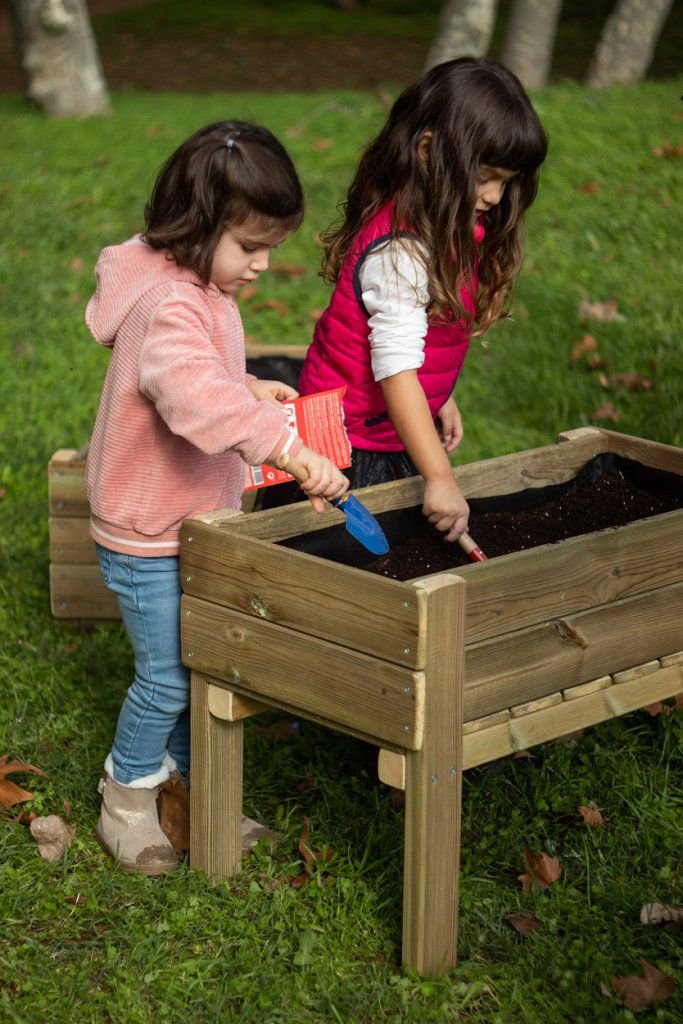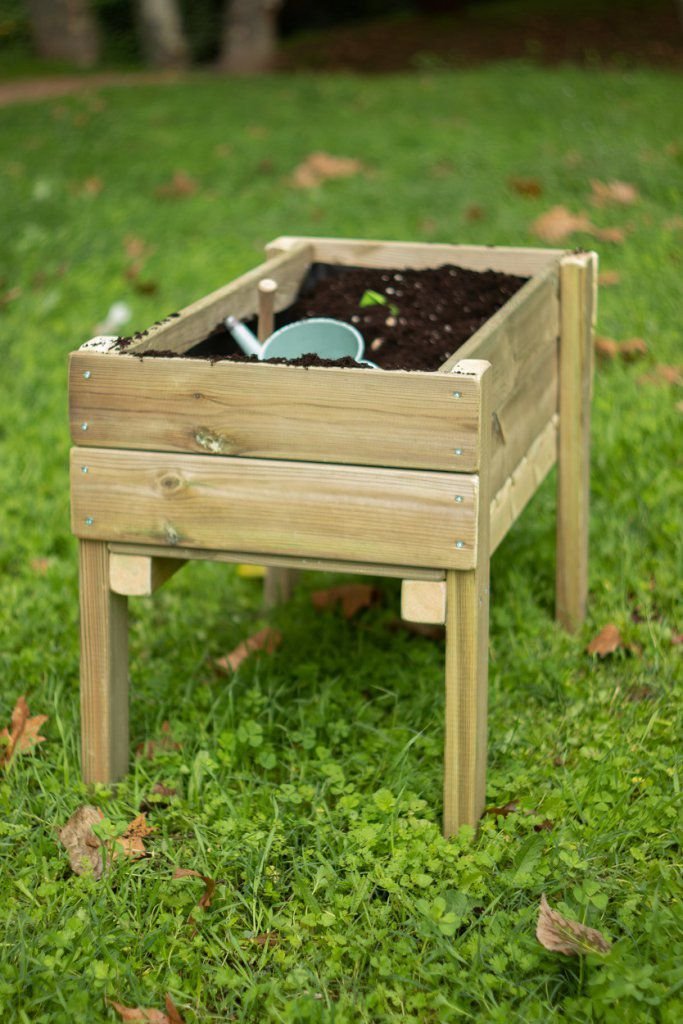Mesa de cultivo Fortis Junior, fabricada en madera tratada para el exterior (nivel autoclave IV) de bosques renovables europeos.