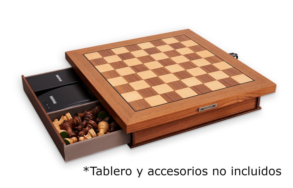 Combina perfectamente con la computadora de ajedrez Millenium Exclusive para ofrecer un juego elevado en un pedestal sin ningun cable ni accesorio de por medio, este noble soporte permite guardar en su cajon todos los accesorios.