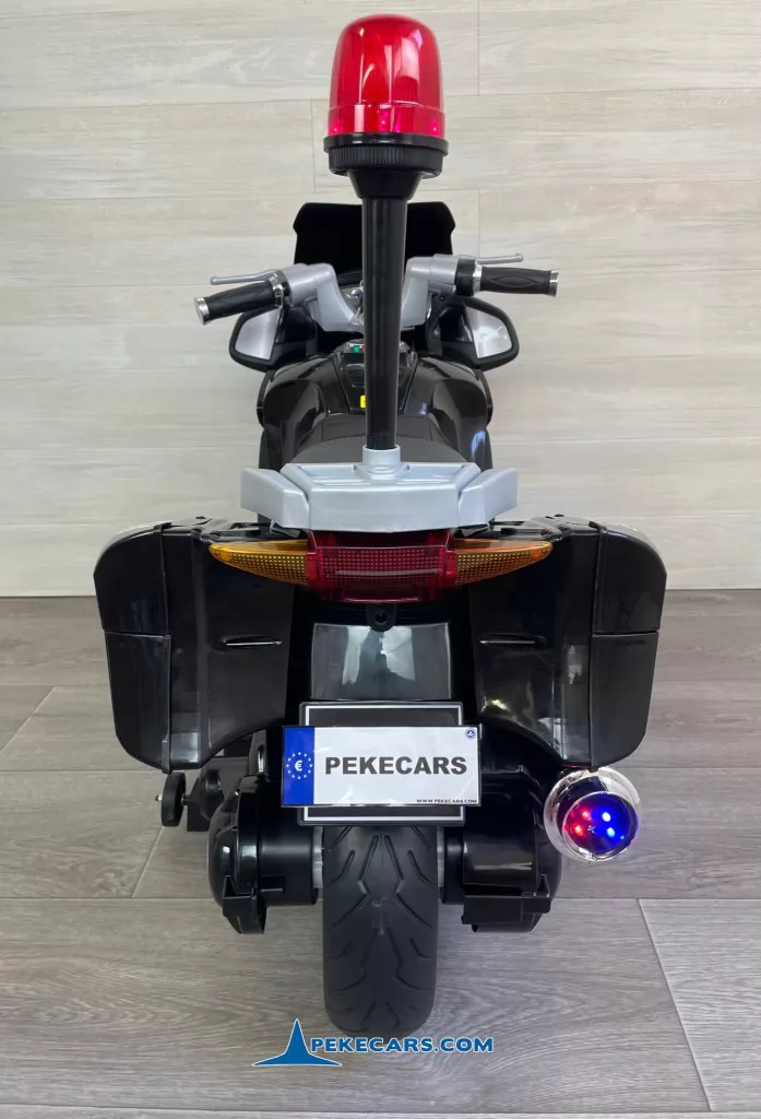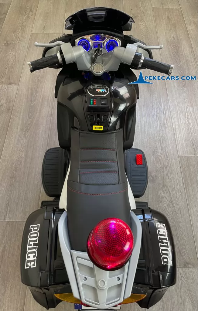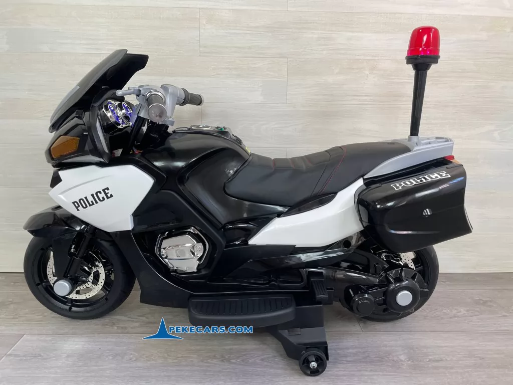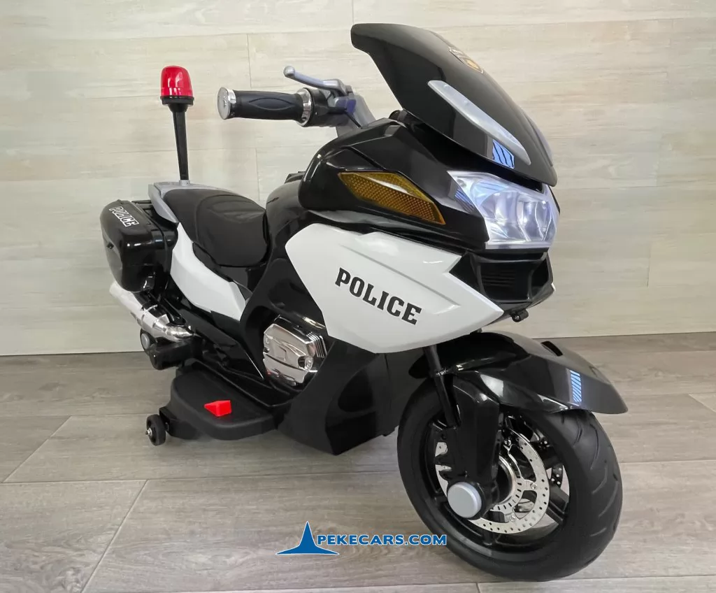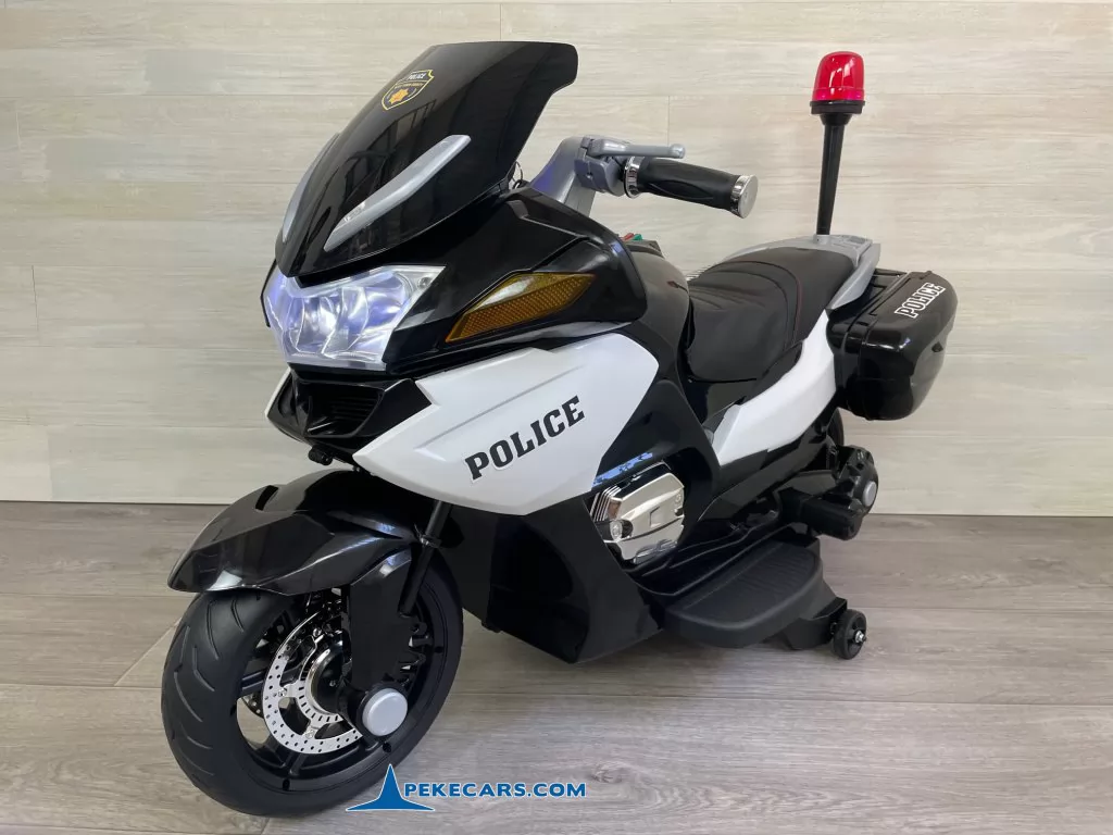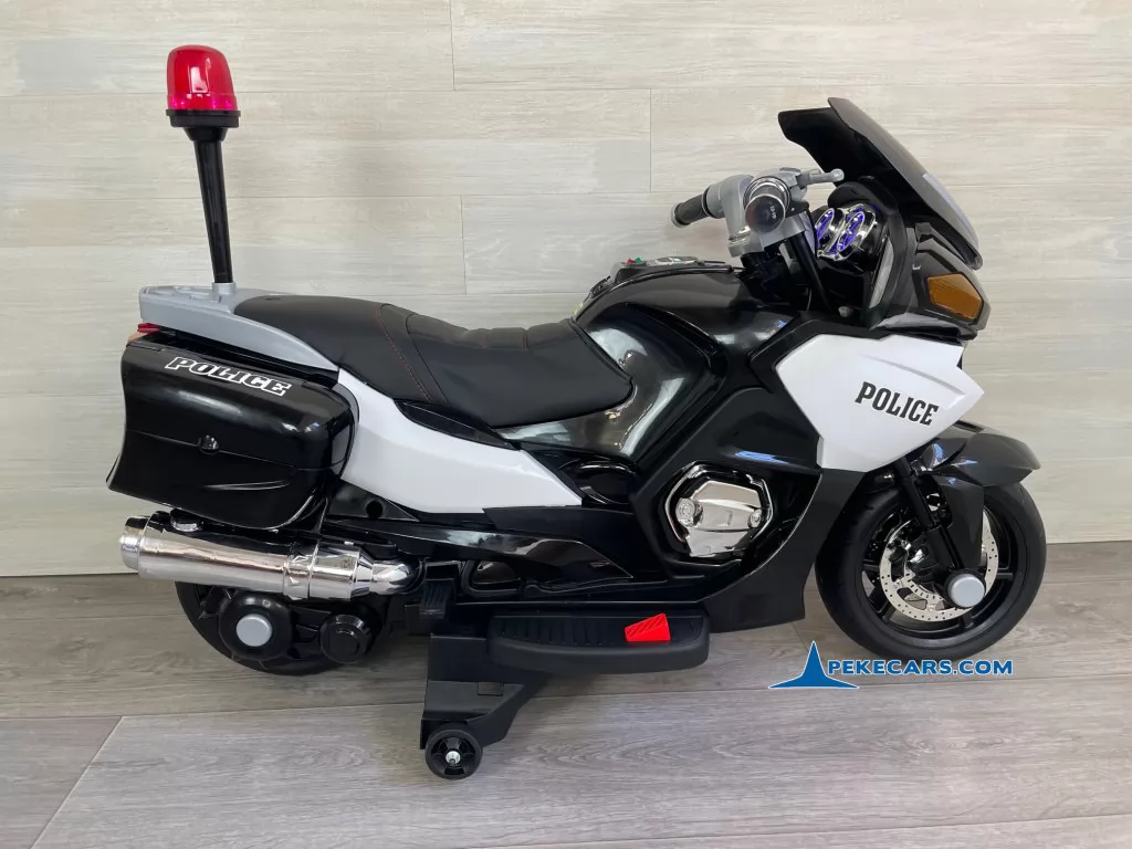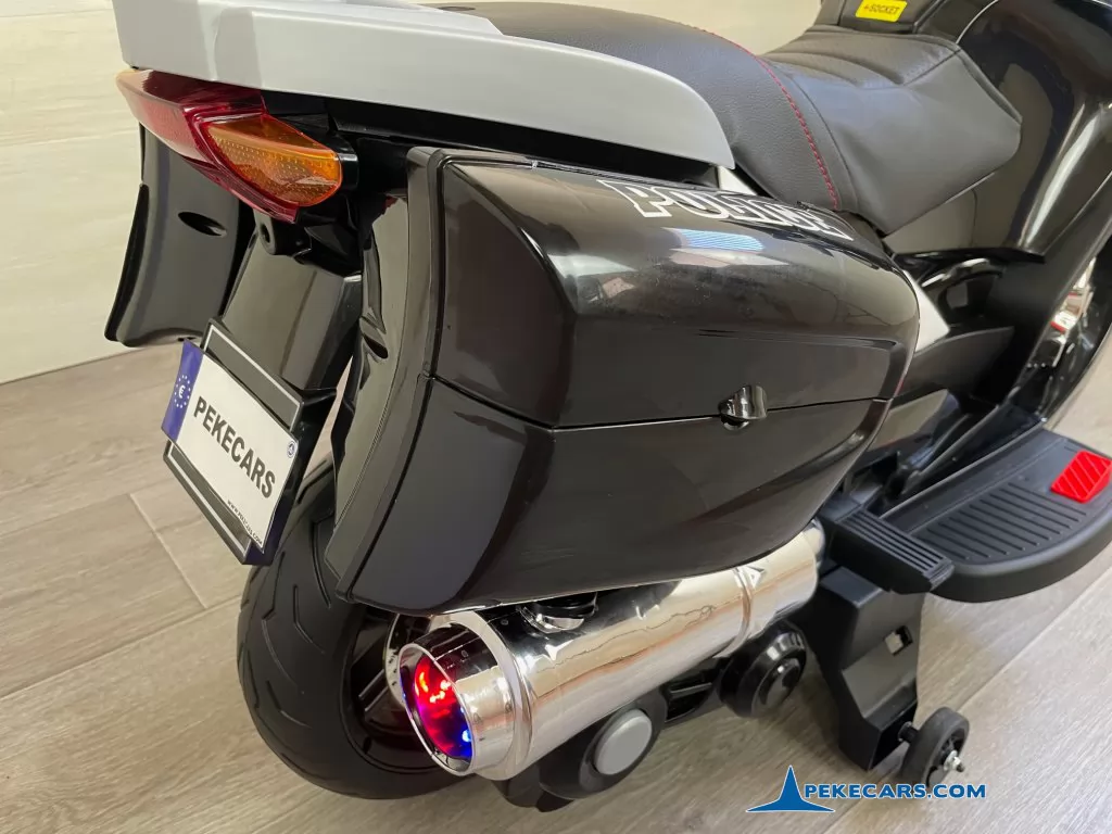 No te pierdas la nueva moto electrica de policia en color negro y blanco con funcion de MP3 y acelerador en el puño. Con una batería de 12V/7Ah optimizada por los mejores fabricantes, esta gran moto de policia es capaz de llevar un niño hasta los 8 años o a dos niños mas pequeños de unos 4 años.