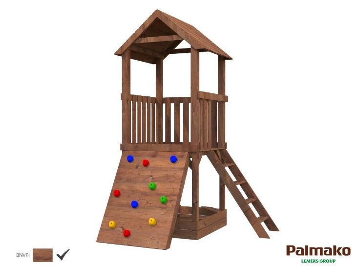 Pared de escalada para Torre con techo infantil de madera Jesper de Palmako. Está fabricado con madera de abeto nórdico especializada para aguantar a la intemperie. Se puede pintar la estructura utilizando pinturas de barniz al agua.