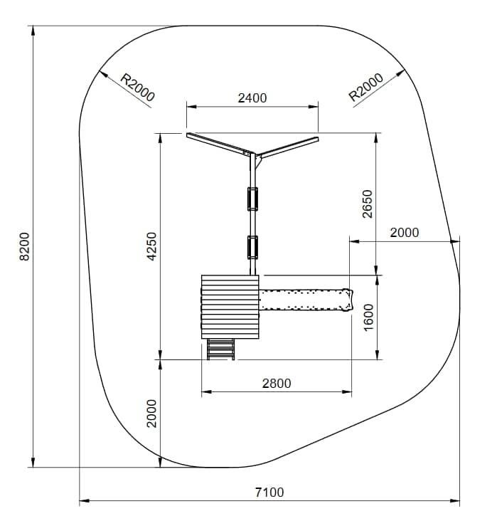 El acceso del parque infantil MASGAMES TALAIA es mediante una escalera de madera hasta el piso superior, a una altura de 120 cm. La plataforma, está protegida por los lados por la baranda de madera. Tiene aperturas solo en el acceso de la escalera y la salida del tobogán. La rampa de tobogán llevará a los niños a nivel del suelo, y volverá a empezar la aventura.