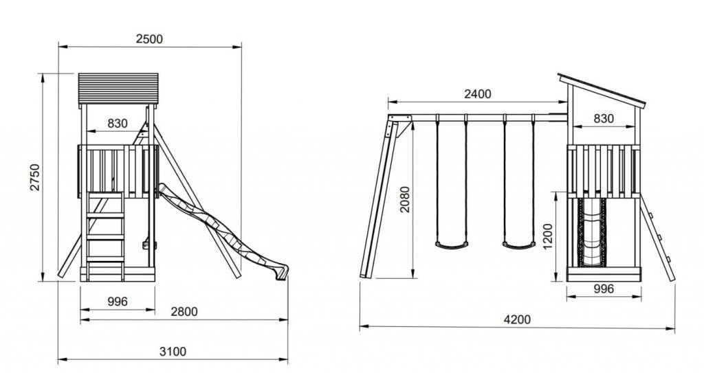 Esta versión del parque Talaia viene con columpio doble. Los asientos que vienen por defecto son los de plástico verdes y cuerdas de nylon regulables.