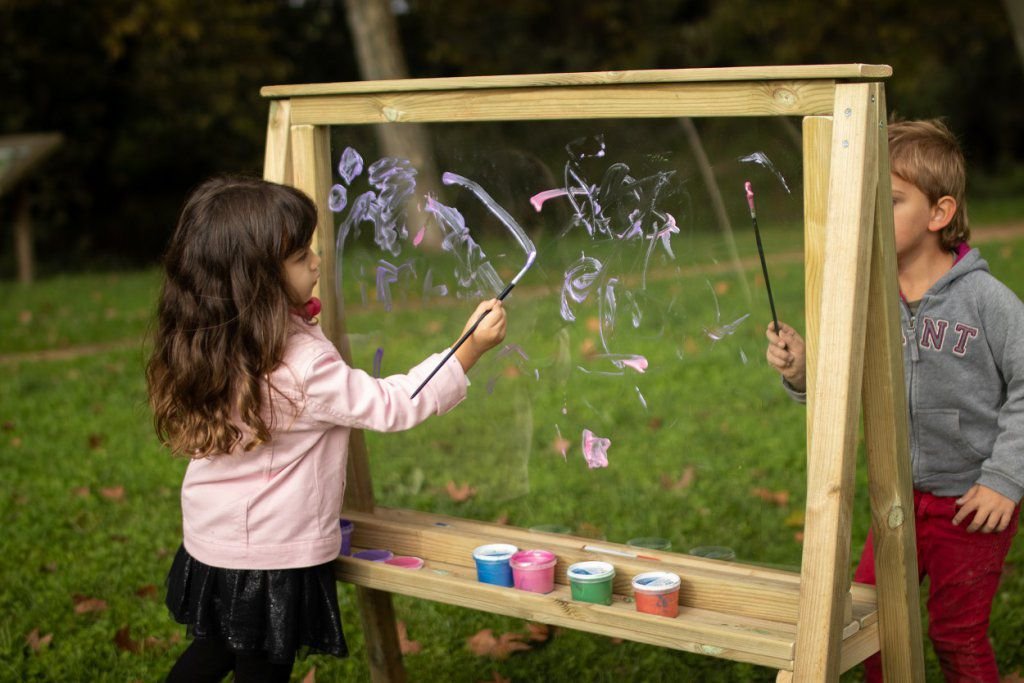La pizarra es una gran placa de poliestireno donde los niños y niñas podrán pintar desde ambos lados de ella. El poliestireno es un plástico reciclable muy transparente y fácil de limpiar cuando se pinta en él. La pizarra dispone de una base donde dejar rotuladores y pinturas mientras se divierten con ella. (El material de pintura no está incluido)