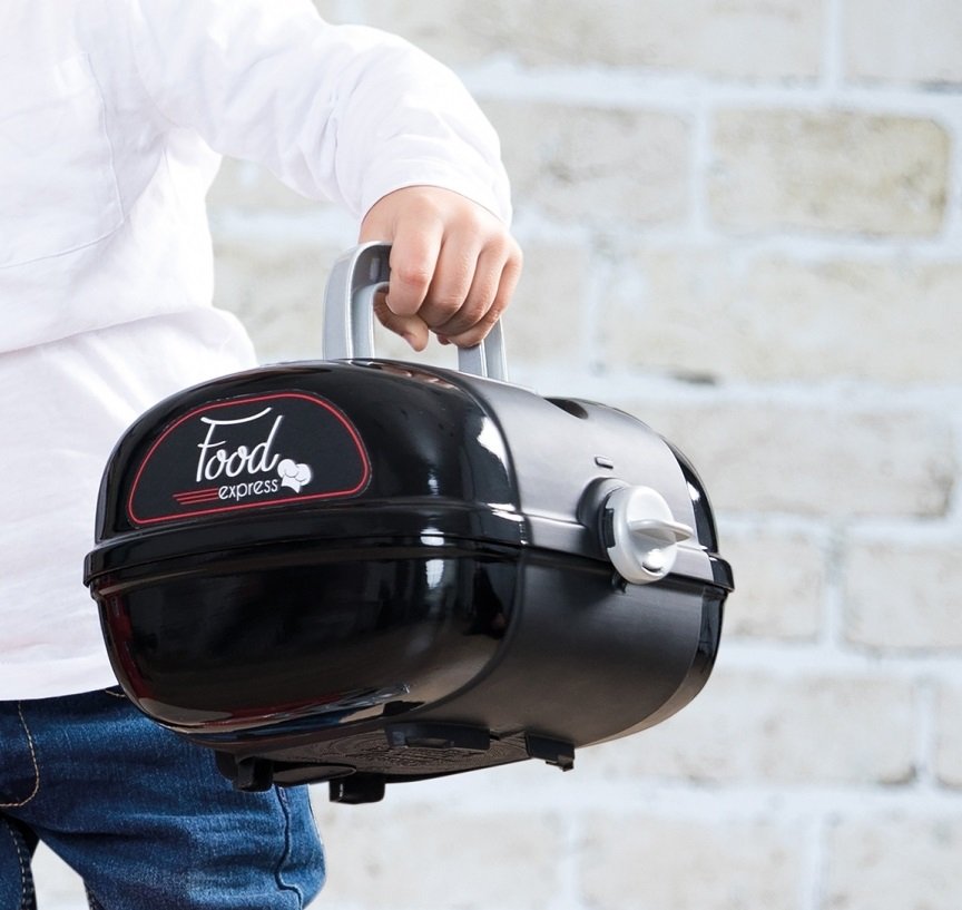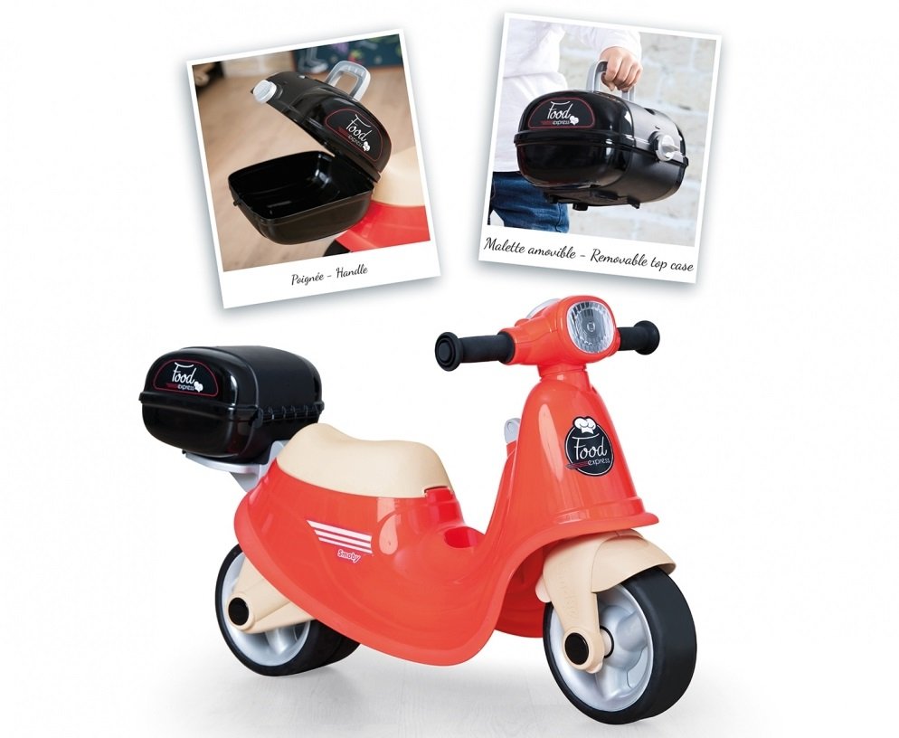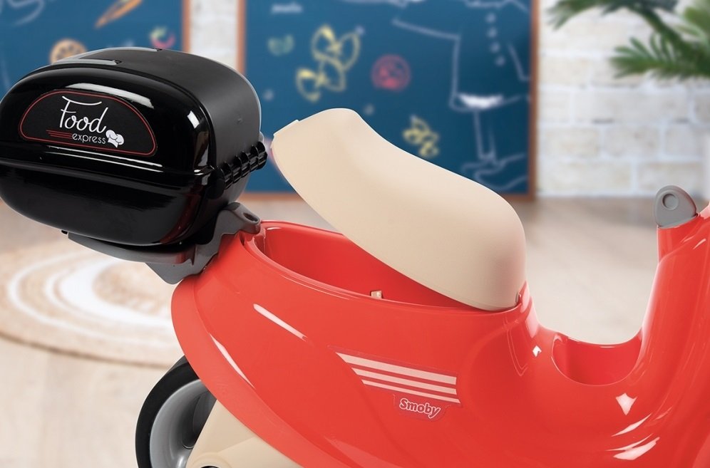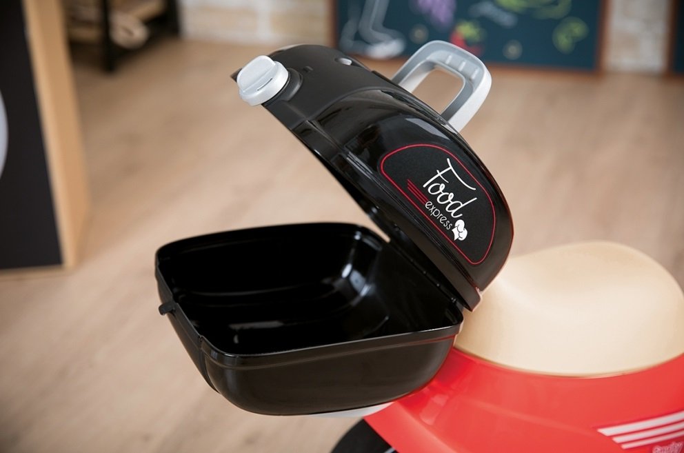 Divertida moto correpasillos con diseño de scooter clásica de reparto de comida. Frontal muy realista, cajón bajo el asiento, ruedas silenciosas y llave mecánica. Cajón maletero con logo en la parte trasera para llevar el reparto, que se abre y tiene un asa abatible en la parte superior.