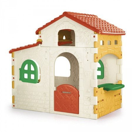 Casa de grandes dimensiones con amplio espacio interior para jugar. Puerta con buzón de cartas, ventanas abatibles, bandeja de juegos.