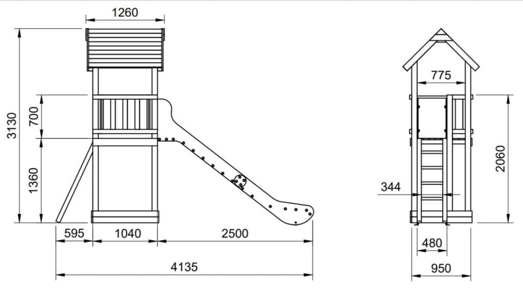 La madera del parque es más gruesa que la de los parques de uso doméstico. Por ejemplo, las lamas de la barandilla pasan de 15 mm de grosor a 21 mm de grosor o las maderas de los pilares pasan de 68×68 a 88×88 mm. Cambian incluso los tornillos de la estructura.