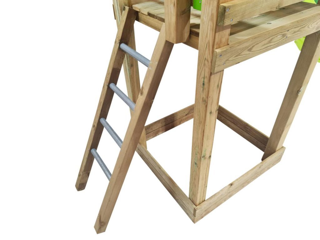 El parque infantil MASGAMES BOREALIS consiste en una torre con tejado que se accede por una escalera de madera con barras metálicas. En la base de la torre hay un arenero.