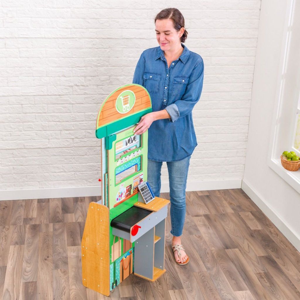 La experiencia de jugar a ir al súper nunca había sido tan inmersiva (ni fácil de preparar). En el Supermercado de juguete Let’s Pretend™ (Vamos a fingir) de KidKraft los peques podrán ojear el mostrador de carne, pescado y charcutería para coger sus alimentos. Cuando tengan su selección, podrán pagar y meter su compra en bolsas en la caja.